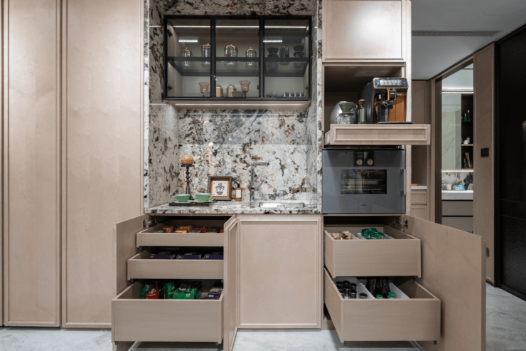 还交付一体化餐边柜(全部用木饰面包裹),咖啡机、各类厨电及酒柜都能在这里找到合适的位置。