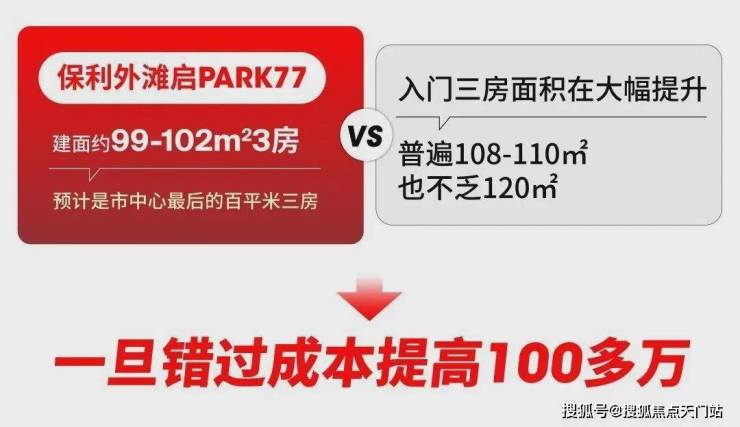 当下市场,入门三房面积正大幅扩容,普遍达到108-110㎡,甚至直接跃升至120㎡。而保利外滩启PARK77 建面约99-102㎡3房,堪称市中心最后一批“百平米三房”,一旦错过,购房成本将直接增加100多万!