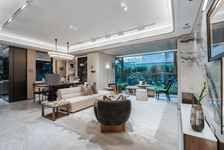 项目以“静奢”为核心,建筑上用铝板与玻璃幕墙构建美学天际线,最大化引景入室。