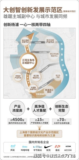 江湾五角场和新江湾城共同构建了大创智创新发展示范区。形成了世界级的产业集群,是“产业浓度、人才浓度、创新生态” 兼具的创新功能聚集区。