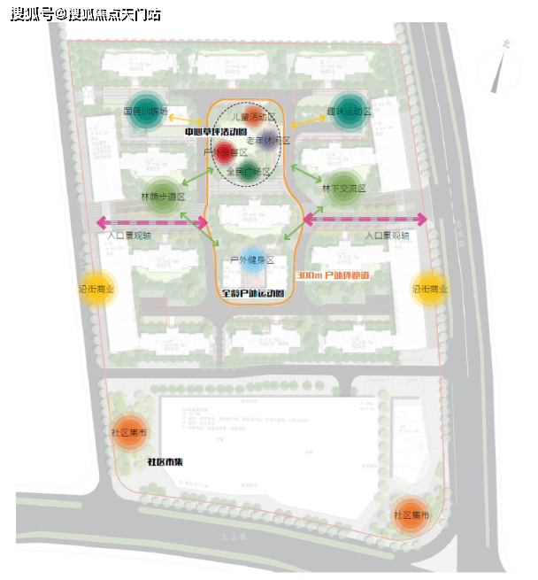 社区功能体系: 人本主义造园宗旨 生态健康活力社区,以“阳光+运动+童梦+暖心”为主题,整体结构规划为“一环两轴多点”园林,打造现代理性的诗意空间。 一环——300m户外环跑道,满足全民乐活运动需求; 两轴——两条景观轴线,打造入户仪式感; 多点——国民训练场+趣味运动区+林荫步道区+林下交流区+户外活动区,打造复合多功能核心景观区。