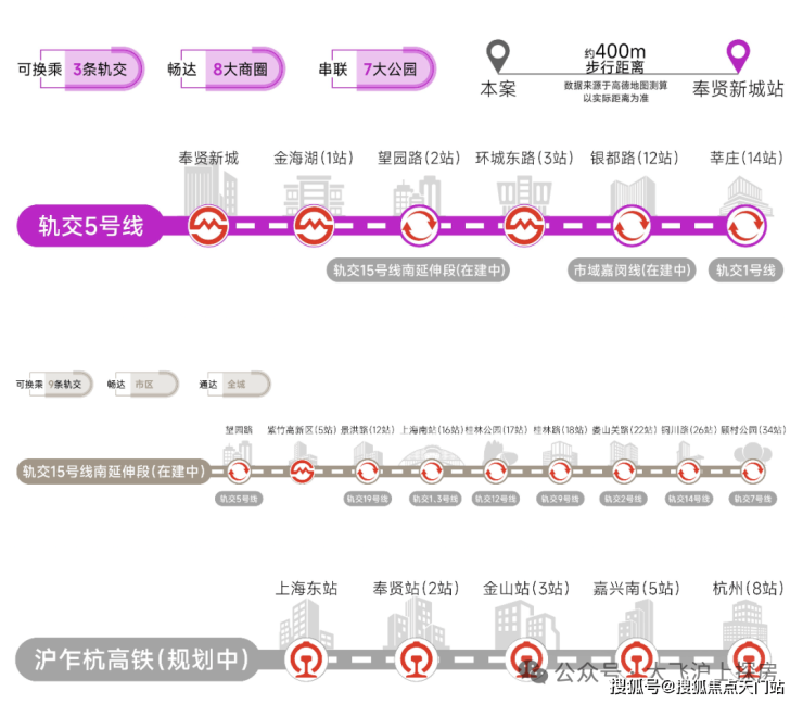 交通方面:项目多轨交环绕,5号线、15号线南延伸段(在建中)、市域嘉闵线南延伸段(规划中)、沪乍杭高铁(规划中)及南枫线(在建中)