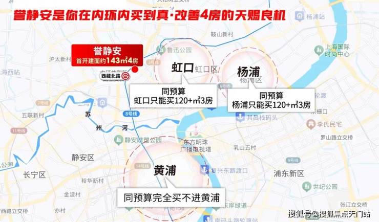 板块内同类产品总价接近2000万级;在静安其他板块如大宁,相似总价仅能购置110m²左右小三房;在虹口或杨浦内环,也选择多为110m²左右小三房。因而,誉静安88以建面约112-119m²大三房实现"相对轻松"的进阶选项,成为改善客户一步到位的理想选择。