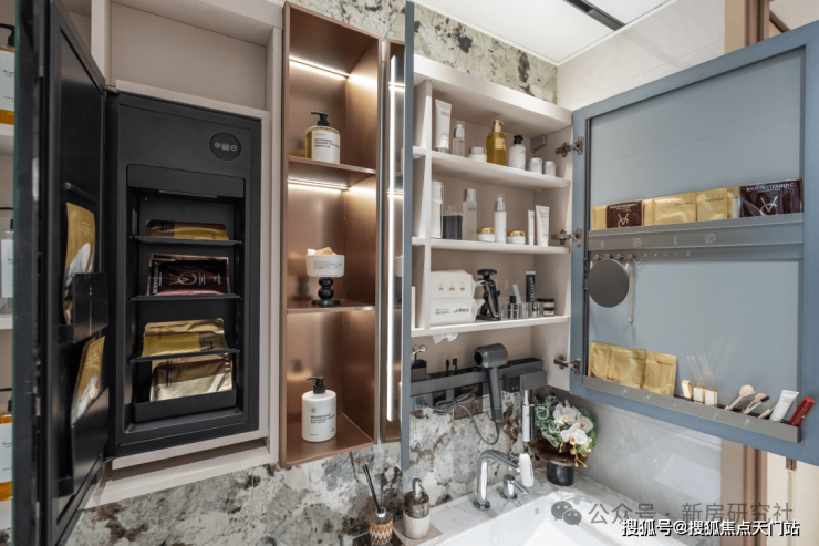 卫浴:镜柜内置分区、卫浴柜斜翻抽等设计,为女主人量身定制。美妆灯与抽拉龙头的 “感官SPA” 系统,将洗漱升级为一场全方位的护理体验。