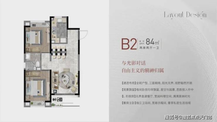 建面约84㎡2房2厅1卫,做到了 双开间朝南+双卧室带飘窗+动静分离,非常宽敞的2房户型。