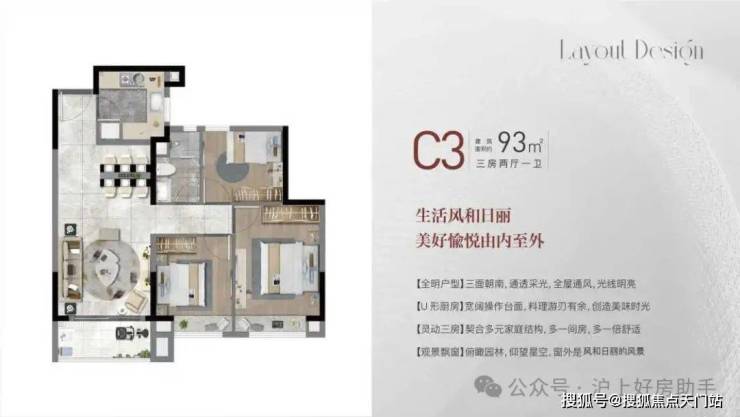 建面约93㎡3房2厅1卫,做到了 三开间朝南+双卧室带飘窗+动静分离,室内通透明亮。