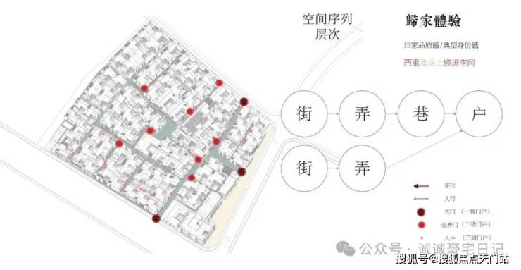 士林润园社区规划可分为蓬莱路城市公共景观以及社区内部景观两个部分,其中市政绿地衔接于上海2035城市总体规划中“蓝绿丝带”的上位条件要求,社区内部街巷空间形成空间序列形成递进的层次,将归家体验的序列依次展开,形成城市街道→入口(一级门户)→街巷→节点空间→里弄门(二级门户)→合院入户(三级门户)的方式,基本可保证大多数住户可体验到两重以上的空间递进。