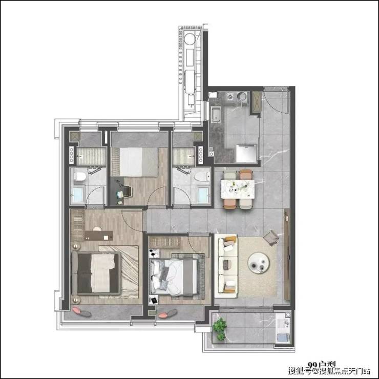 建面约99㎡的三房设计,在空间上使用功能更加多样化, 一站式解决了家庭生活的所有功能,优化居家动线,大大提升空间的居住体验。