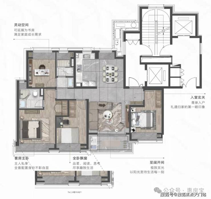 建面约135㎡灵动四房,以多一室的自由定义,让孩子的玩具、绘本、钢琴都能找到专属领地,同时保留完整的家庭社交场域;双南向次卧+北向多功能房,既满足老人同住的照护需求,也为未来的家庭结构变化预留调整空间;弹性书房可变儿童房进行过渡,形成双孩独立成长空间。