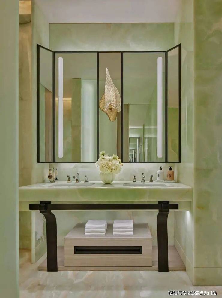 顶层下午茶区以淡绿为底,壁炉暖光漫过手绘地毯的肌理,将社交场域沉淀为冥想容器;主人房墙面缟玛瑙(Onyx)的天然流痕,也与一层屏风暗纹形成时空对位,光影在矿物晶体中生长出私密的诗。