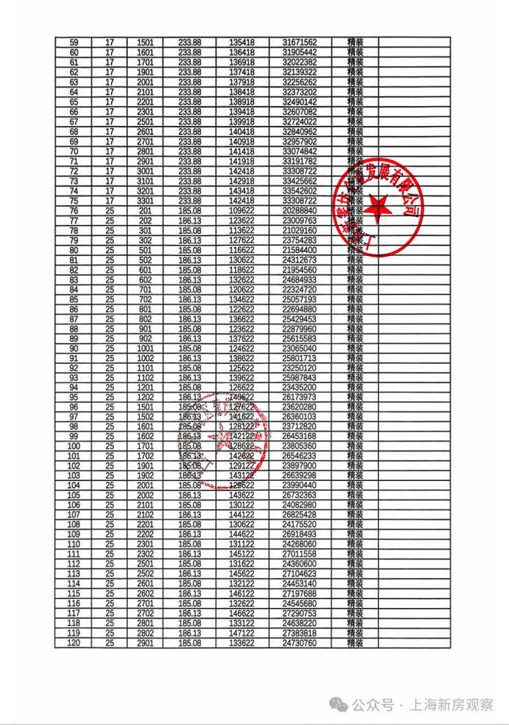 上期一房一价表如下: