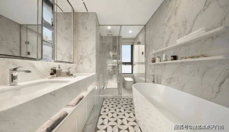 此外,室内还大量运用 雅士白大理石 、 大花白岩板 、 皇家孔雀岩板 、 水纹夹丝玻璃 、 仿洞石岩板 、 卡拉卡塔白岩板 、 灰色皮革 等定制材质,以 华润置地独有的“五奢体系” , 彰显着对高品质生活的极致追求