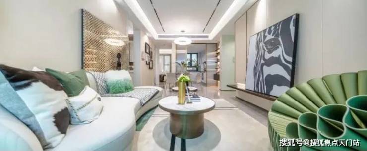 客厅和主卧都标配悬浮吊顶、无主灯设计,背景墙采用皮革和铝合金拼接,也都是实体交付的。