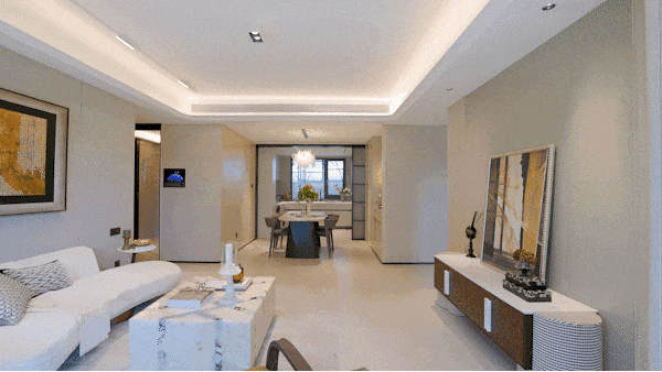 四开间朝南的方正格局 如画卷展开,南向面宽将阳光编织成流动的绸缎,晨光在定制皮革硬包电视墙上跃动,金属条勾勒的几何线条与墙布的温润质感相映成趣。