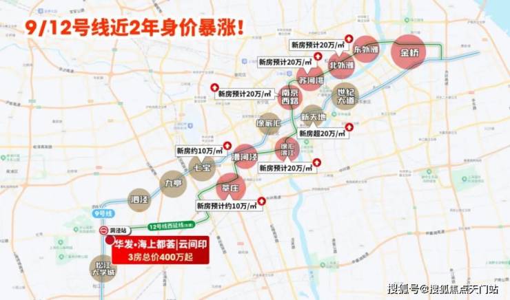一条在建的12号线西延伸段, 串联起老静安、苏河湾、北外滩多个重要商务区,拥有多达13个换乘站的“地铁换乘之王”。25年12号线沿线的房价暴涨,项目作为12号线延伸段的关键枢纽,价值也随之高涨。