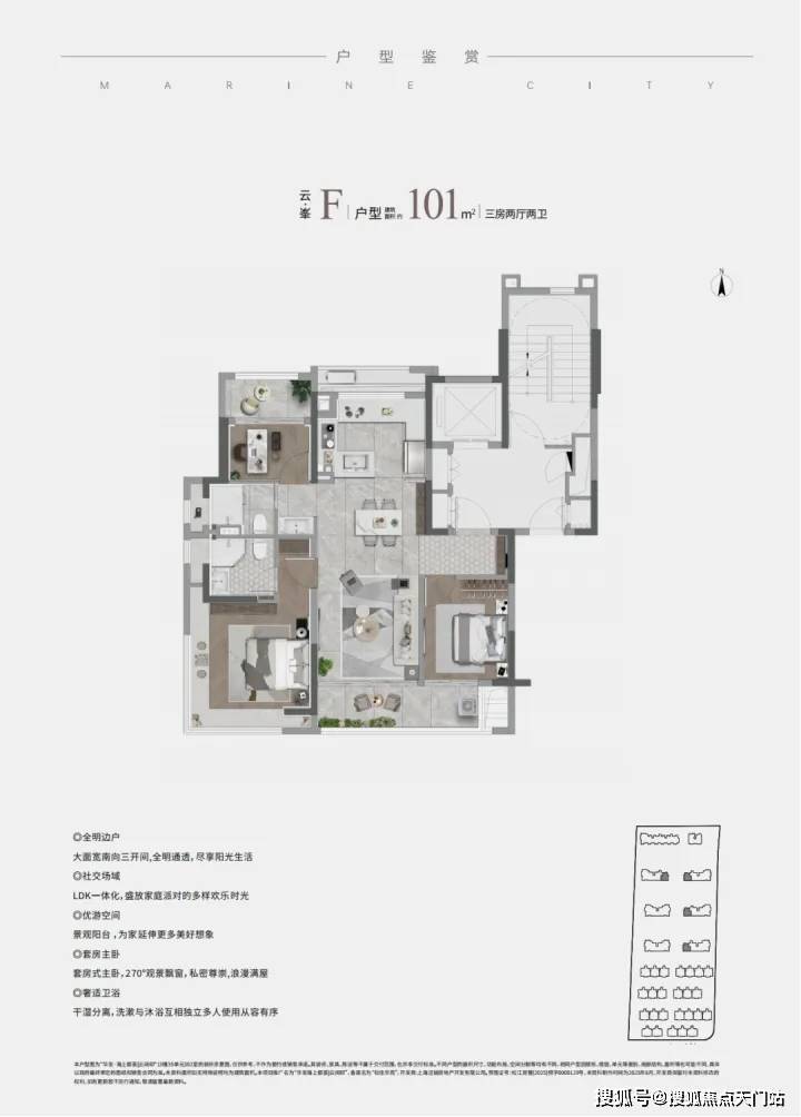 LDK客餐厨一体、在百平户型段引入南向双联阳台与独立功能阳台,主卧配置270°的L型环景飘窗,年轻小夫妻居住首选!