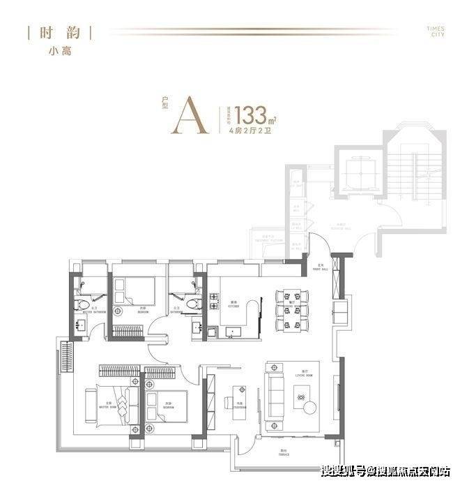 建面约133㎡4房(小高)约5.9m大面宽大横厅+主卧270°转角窗