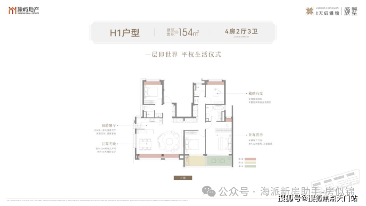 建面约154㎡中平层:约14.2米南向巨幕面宽,结合约7.1米奢阔横厅,塑造出开阔明亮的、兼具仪式感与舒适度的家族聚光主场。四间卧室科学布局,从容满足二胎家庭或三代同堂的居住需求。每间卧室皆享独立私密,让家人各安其境,和睦相融。南向双景阳台与露台,将郊野公园的四季风光引入室内,让自然成为日常生活的背景。