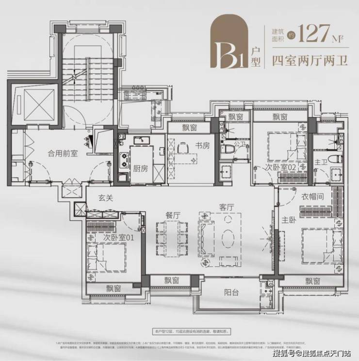 来看看更大一点的户型—— 建面约127㎡超阔四房,同样是 南向横厅设计,并拉伸至4开间,空间舒阔。 主卧套房设计,也有足够的收纳,打造专属秀场。
