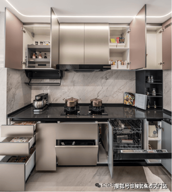 建发海宸打造了超容量橱柜,以更丰富的立体收纳空间,让空间化繁为简、化整为零,配齐吊柜拉篮、双侧台面调料柜、餐具与厨具收纳等,确保做菜时随手能拿到想要的调料,真正做到藏纳有道,拿放有序。