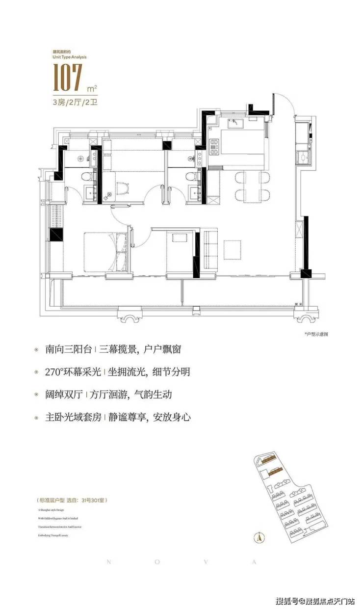 107平3房2卫,开发商号称实得率接近100%,做出了这个面积段罕见的5米面宽、9米纵深的客餐厅。