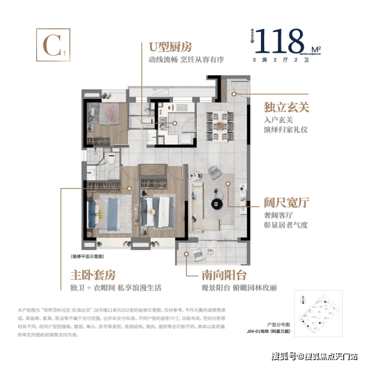 其中,建面约118㎡3房2厅2卫,奢享独立入户玄关,演绎归家礼序;坐拥南向瞰景阳台,奢揽无界阳光,部分楼栋更可直瞰约14.3万㎡莫比乌斯公园胜景,自然辉映窗前,四季于此收藏。