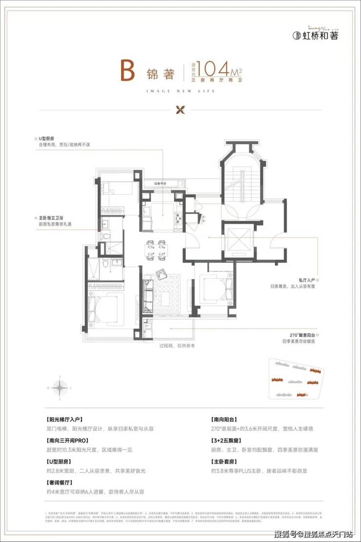 建面约104㎡3房,在建面94㎡小3房优点上,又进一步升级了尺度感, 约10.3m的南向面宽,为室内带来了出众的采光面和尺度感,这个户型无论从实用性、尺度感,亦或是视野、采光、私密性来说,都做得相当优秀。