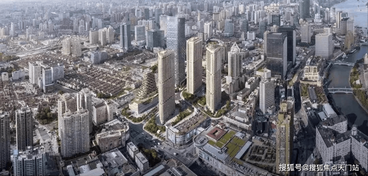 480米的浦西第一高楼以及两座分别高达380米和320米的超高层写字楼鸟瞰浦江。