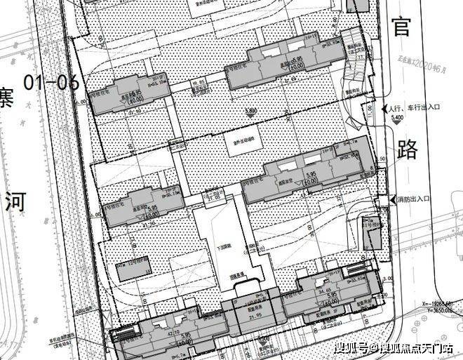 01-03(中间),规划10幢楼,其中一幢为保障房,总高17-18-20层,小区中心位置的商品一楼为架空层,南北楼间距30米。