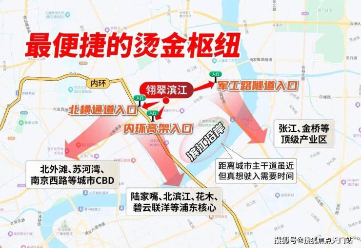 其他滨江一线的项目,想要去往浦东、浦西核心商圈,都要绕到翎翠滨江所在的片区,才能驶入快速路网。