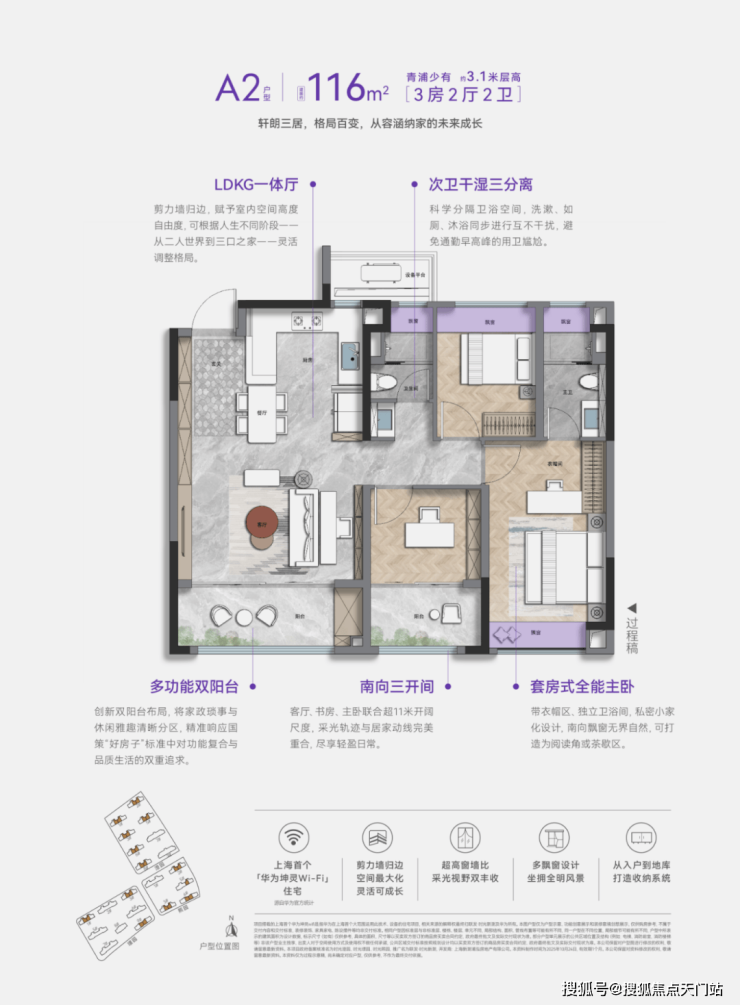 标配华为智能门锁 ,行业领先的掌静脉解锁技术;全屋覆盖上海首个华为坤灵Wi-Fi6智慧入户,信号无死角。