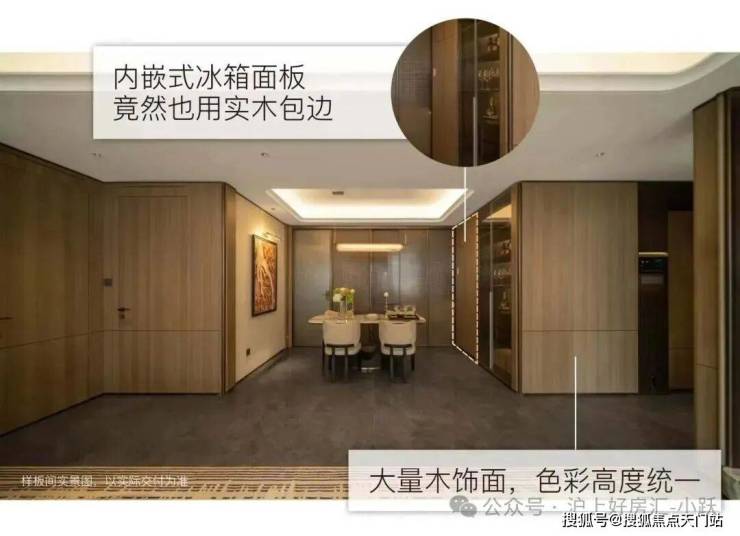 项目墙面铺设大量木饰面,相比墙布,更具质感更温馨。同时为了保持室内色调的统一,建面126㎡内嵌式冰箱的面板也采用木饰面。