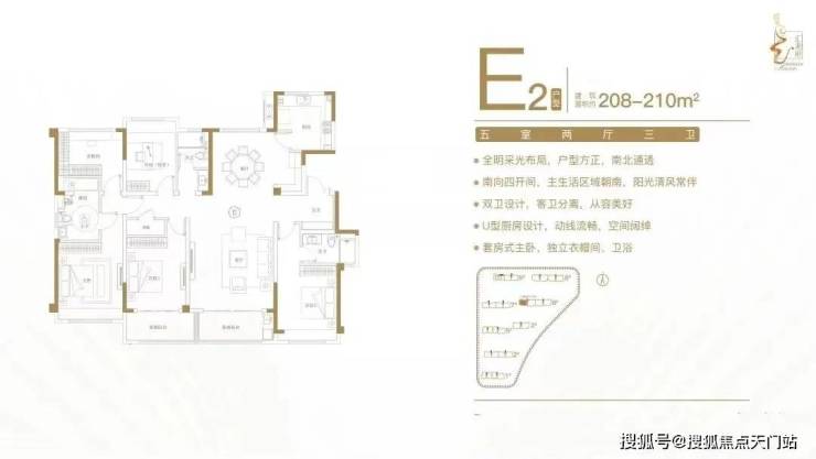建面约208-210㎡五室两厅三卫户型特点:全明采光布局,户型方正,南北通透;南向四开间,主生活区域朝南,阳光清风常伴;双卫设计,客卫分离,从容美好;U型厨房设计,动线流畅,空间阔绰;套房式主卧,独立衣帽间、卫浴。