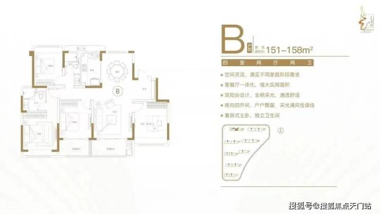 建面约151-158㎡四室两厅两卫户型特点:客餐厅一体化,空间实用,尺度开阔;多功能间设计,满足不同居住需求;全明采光布局,横厅设计,明厨明卫;南向四开间,主生活区域朝南,阳光清风常伴;套房式主卧,主卧带飘窗,独立衣帽卫。