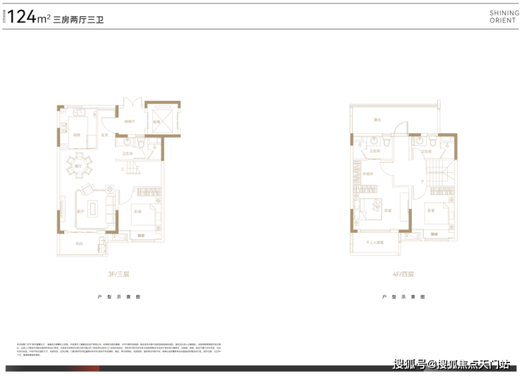 叠墅总高四层,设计了邻里空间,单元门设计也是非常的大气。上叠125㎡三房两厅三卫,顶楼闷顶层等可以拓展空间;下叠140㎡四房两厅三卫,另有超宽裕的赠送面积。