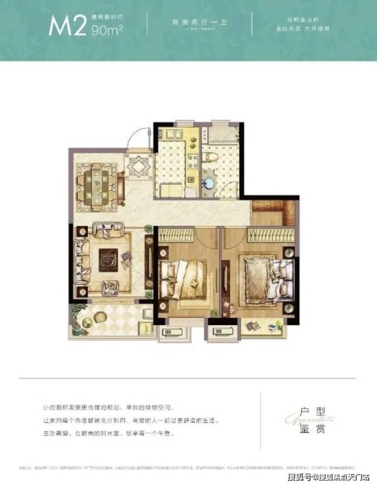建面约90㎡2房2厅1卫,两间卧室朝南,舒适尺度搭配观景阳台,干湿分离的独立卫浴。