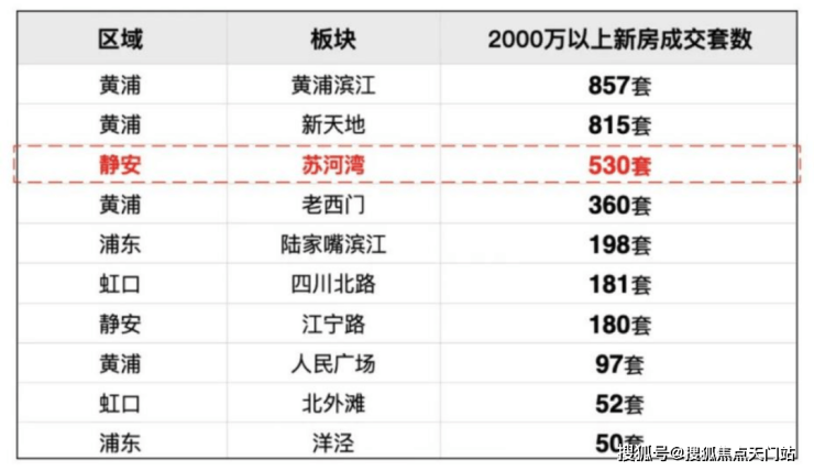 第一:去年约2000万以上的新房成交套数,苏河湾是全市第三,仅次于黄浦滨江和新天地。