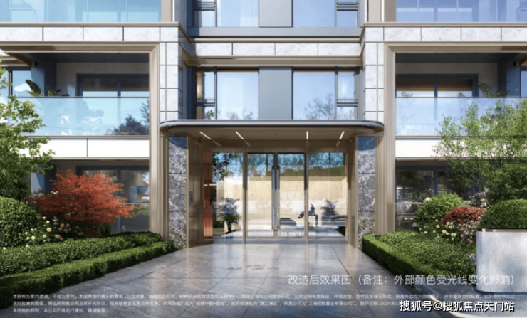同时, 在入户大厅的外墙上也采用香槟金铝型材与灰色石材,门头雨棚采用香槟金色弧形铝板装饰,搭配大玻璃面, 这个颜值和尊贵感,在这个价位段十分难得。