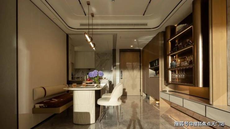 比如说,圆弧形吊顶让空间更具柔和美感,金属线条提升空间的层次感,细节之处精致考究。