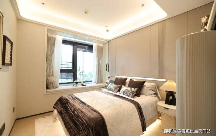 再来看看134㎡3室2厅2卫样板房。比起112㎡户型,这个客厅要宽敞很多,岛台也可以做成独立样式,摆放6人长桌也绰绰有余。主卧采用270度拐角飘窗设计,采光面拉满。