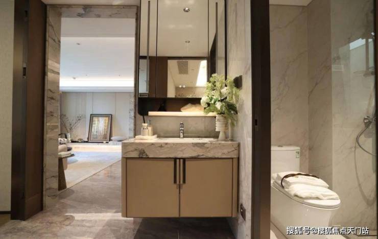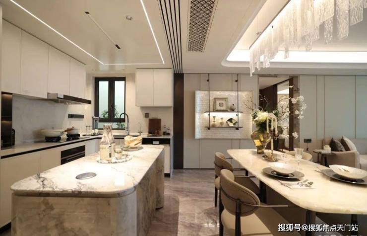 来到建面约112㎡3房2厅2卫样板房,设计主打海派风格,开放式厨房和西餐岛台,卫生间地面拼花,石材台面镀金龙头。标准的三开间户型,设计上将传统的过道改为餐厅空间,将公共区域做大了。