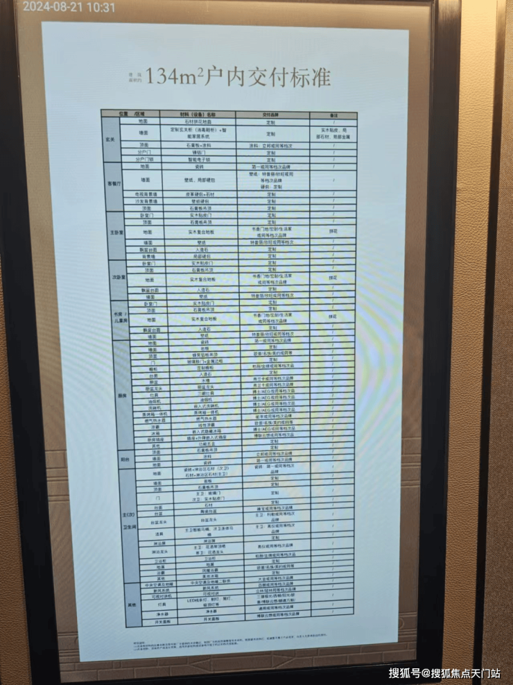 装标,大金的中央空调和地暖,白朗新风。厨房标配博士的三眼灶、油烟机、洗碗机和冰箱,134加配蒸烤一体机;卫生间高仪的洁具和花洒、科勒的龙头。