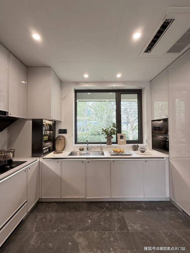 比如,厨房配了珍珠白吊柜、三组抽屉式拉篮合理搭配,调料架收纳、大容量踢脚抽、清洁用品收纳区,米面粮油、碗碟刀叉都可完美隐身。