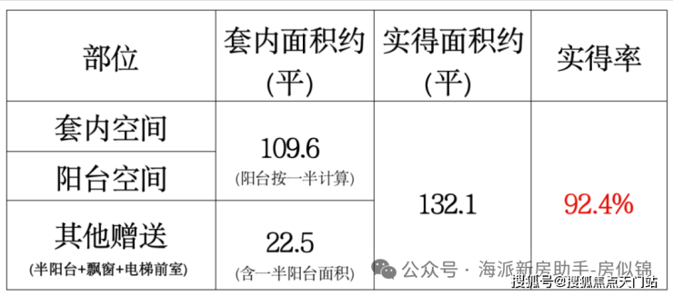 建面约143平四房阳台附赠更大、门口的私家电梯厅预测能有9-9.5个平方的附赠;如果都加在一起,实得率超92%,实际可利用面积超过132平!