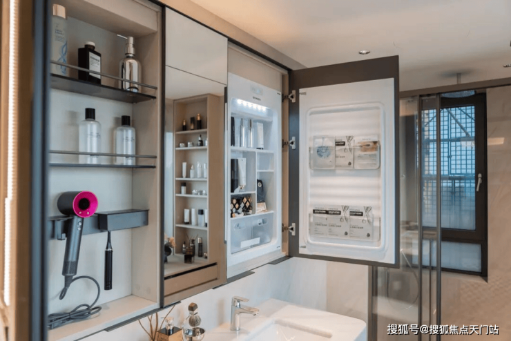 卫生间的镜柜设计,内设三宫格镜柜收纳:左侧是日常洗漱用品,中间作为护肤常备收纳,右侧是美妆冰箱收纳。