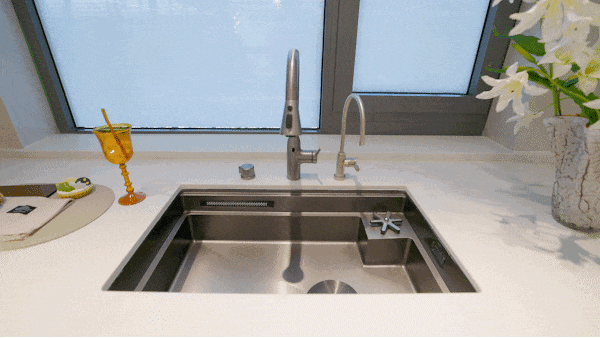 比如厨房北侧台面全部都采用了飘窗,可以在飘窗上面放置定制尺寸的大单槽;