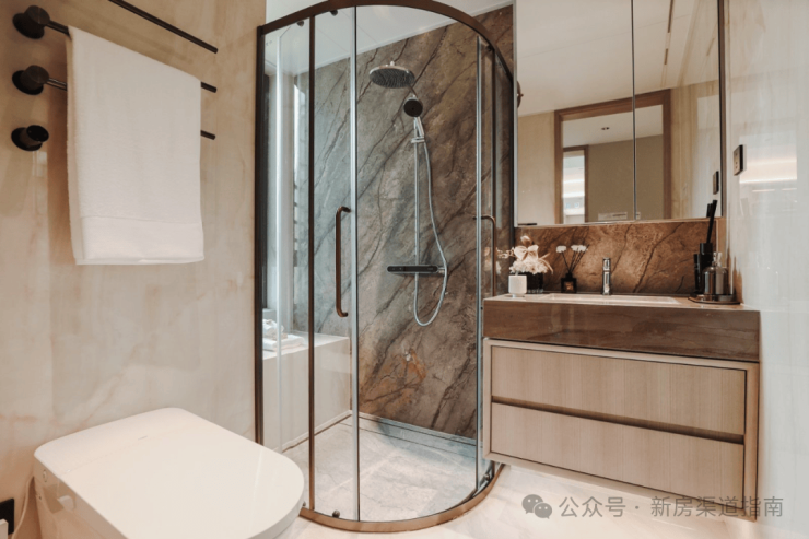 同时卫生间配有杜拉维特的面盆、汉斯格雅的龙头+五金、AO史密斯燃气热水器、杜拉维特智能马桶(建面约139㎡户型)、恩仕智能马桶(建面约110㎡户型)等国际一线大牌,这个标准放到南大甚至是整个中环沿线,都是顶配级别。