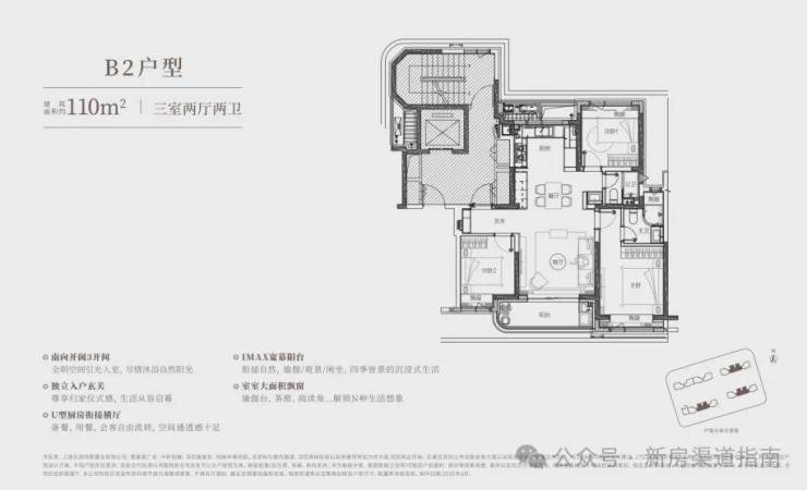 建面约110㎡边套(B1户型),1个宽面阳台、5个飘窗,整体南向面宽做到了约12.3米,大横厅面宽约5.4米,带来超大空间体验和充足通风采光。更为难得的是,该户型标配了全屋飘窗,主卧更是拥有270°转角飘窗,拓宽室内景观视野的同时,增加了实际空间使用率,加上三玻两腔系统窗隔音,在欣赏窗外景色的同时,也不会被噪音打扰。建面约110㎡中间套(B2户型),也同样做到了南北通透,三开间朝南,洄游动线,布局合理,无论是空间尺度还是通风采光,与边套享受一样的品质感!