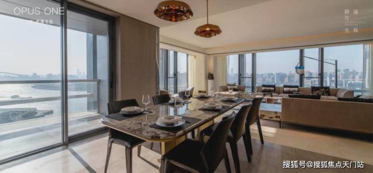 这客厅既是270°全景舱厅,无论全家在餐桌前欢聚一堂,还是孩子们在客厅嬉戏,一抬头便是以江景和城市为主题的巨幅油画。