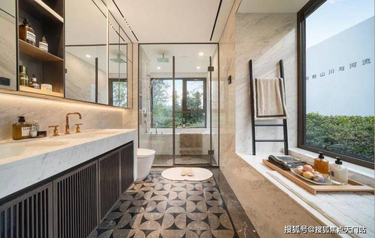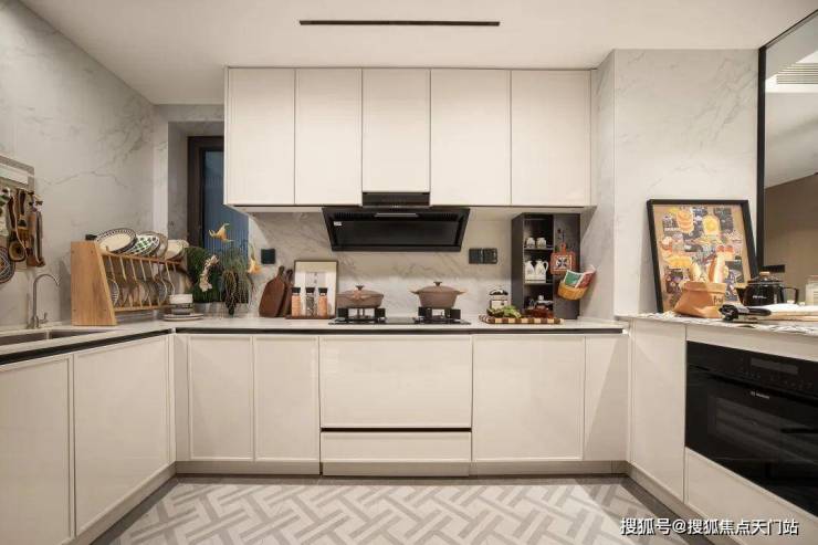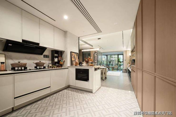 厨具采用 博世四件套(燃气灶、油烟机、洗碗机、蒸烤一体机), 东芝双开门冰箱,水波纹的夹丝玻璃移门,是万豪酒店的同款,厨房墙面也全都是岩板交付。